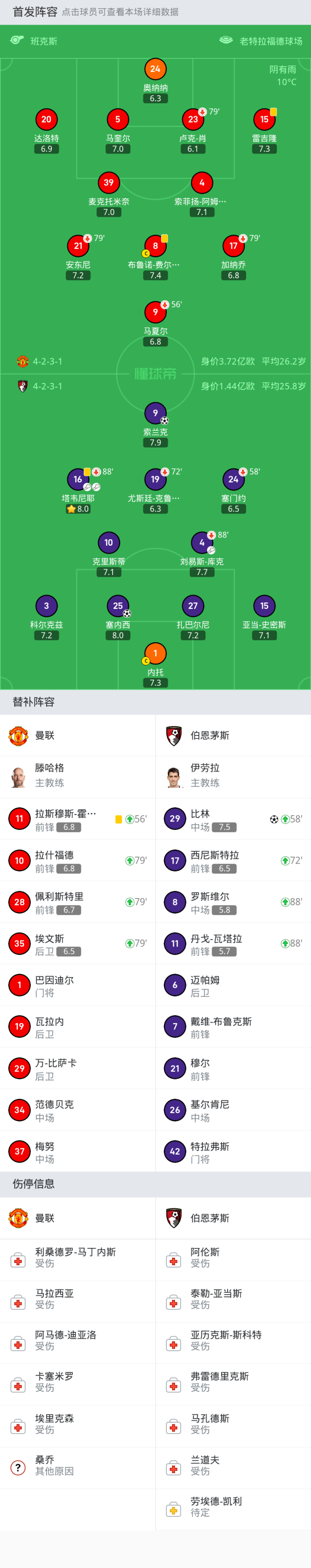替换下场:79'23-卢克-肖, 56'9-马夏尔, 79'21-安东尼, 79'17-加纳乔