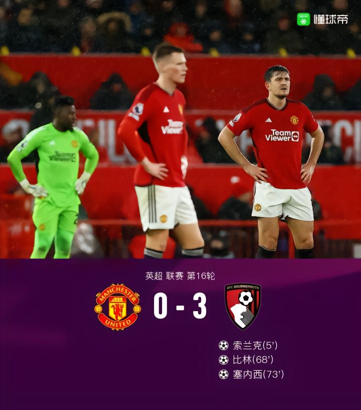 第73分钟,又一个惨案?塞内西头球破门,曼联主场0-3伯恩茅斯