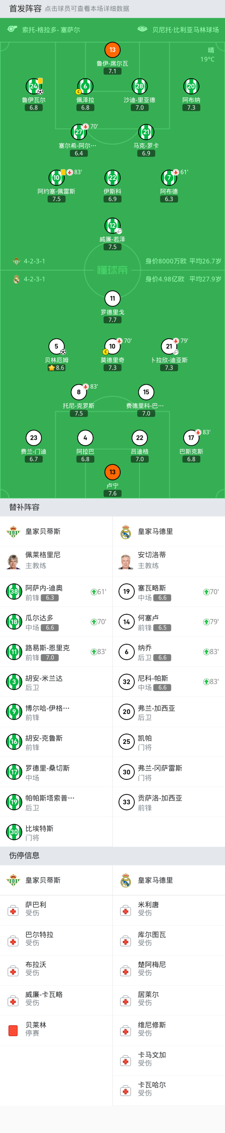 皇家贝蒂斯首发:12-威廉-若泽, 22-伊斯科, 6-佩泽拉, 13-鲁伊-席尔瓦, 10-阿约塞-佩雷斯, 21-马克-罗卡, 24-鲁伊瓦尔, 7-阿布德, 27-塞尔希-阿尔蒂米拉, 28-沙迪-里亚德, 20-阿布纳