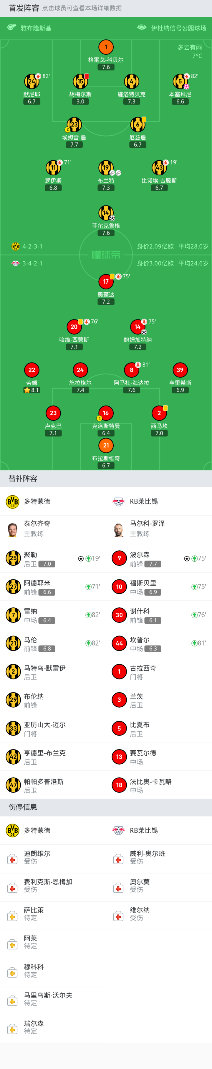 第19分钟,多特调整,聚勒登场,吉滕斯被换下