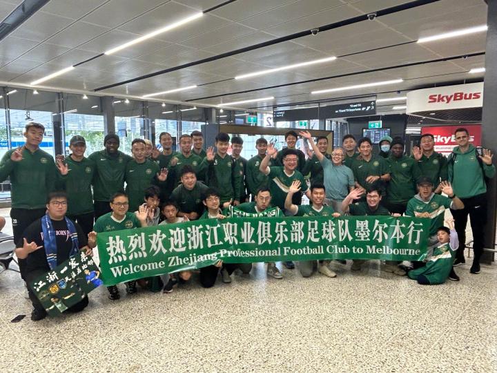 从官方发布的信息来看,当地华人和留学生朋友组织了接机活动,浙江队受到了热烈欢迎。全队还与前来接机的当地华人和留学生朋友合影留念。其中,球迷代表手持“热烈欢迎浙江职业俱乐部足球队墨尔本行”“江浙一家亲,天涯若比邻”等欢迎条幅和宣传板。
