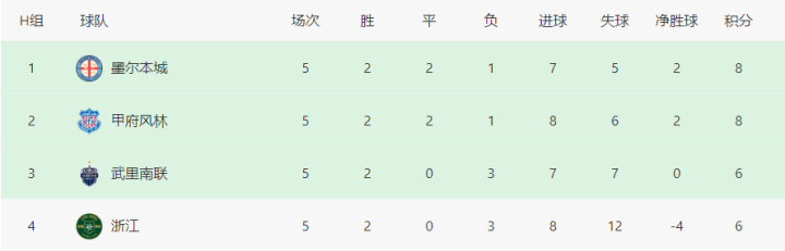浙江队所在的H组,依然充满悬念。小组赛收官战前,竟然都有出线希望。具体来说,5轮战罢,浙江队即将挑战的对手,也是该组目前的领头羊墨尔本城,积8分,凭借胜负关系优势,力压同积8分的甲府风林,位居榜首;甲府风林位居次席。末轮,双方只要取胜,除第1之外,第2也有望出线。武里南联、浙江队同积6分,分列第3、第4。两队理论上也有出线机会。其中,浙江队必须客场大胜墨尔本城,多拿净胜球,还要期待在与其他4个小组第2比较中,进入前3。