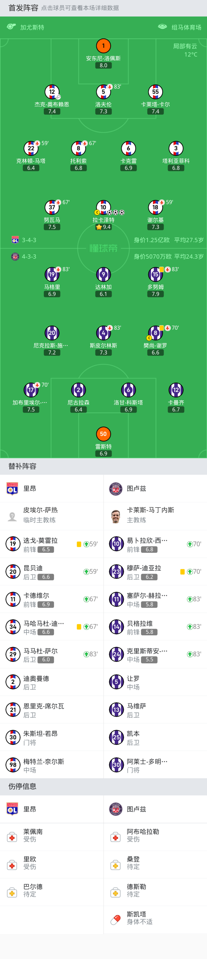 里昂首发:5-洛夫伦, 10-拉卡泽特, 3-塔利亚菲科, 1-安东尼-洛佩斯, 22-克林顿-马塔, 8-托利索, 55-卡莱塔-卡尔, 6-卡克雷, 18-谢尔基, 12-杰克-奥布赖恩, 37-努瓦马