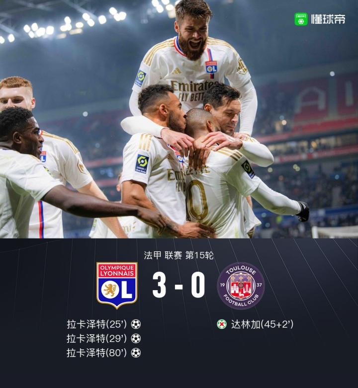 北京时间12月11日法甲 联赛 第15轮,里昂主场对阵图卢兹。上半场,拉卡泽特攻入两球,达林加点射被安东尼-洛佩斯扑出;下半场,拉卡泽特再入一球完成帽子戏法。最终里昂3-0战胜图卢兹。
