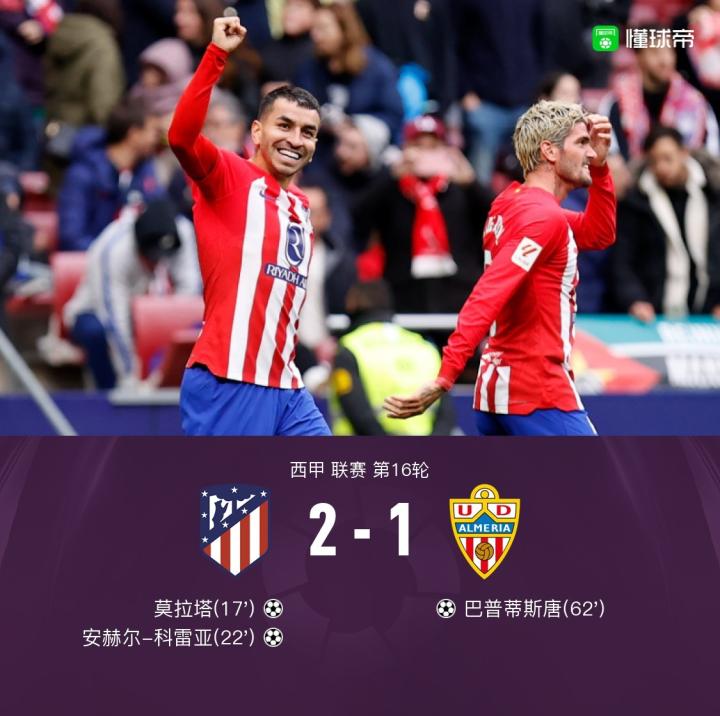 【马竞2-1阿尔梅里亚,莫拉塔破门,科雷亚建功,格子进球被吹】