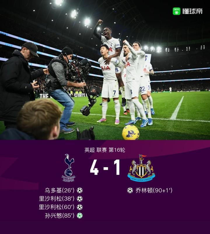 【剑南春|热刺4-1纽卡结束5轮不胜,孙兴慜1射2传里沙利松双响】