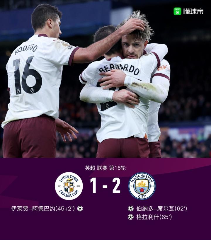 【剑南春|曼城2-1逆转卢顿结束四轮不胜,B席、格拉利什破门】