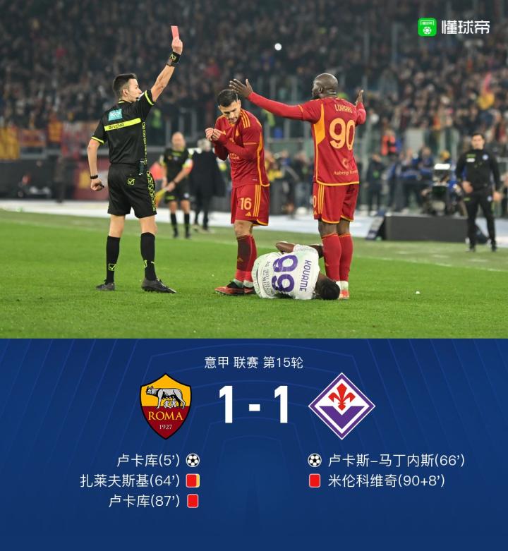 【9人罗马1-1佛罗伦萨,卢卡库闪击+直红,迪巴拉、阿兹蒙伤退】