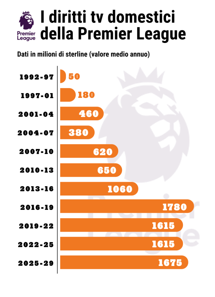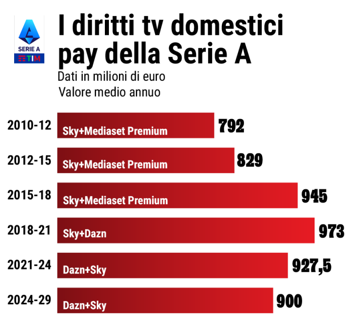 按照目前的汇率,他们的收入为78亿欧元,年收入为19.5亿欧元,是意甲联赛的两倍。在2024-29赛季的五年期间,意甲联赛已经以每赛季9亿欧元的价格将国内转播权出售给DAZN和天空电视台。诚然,英超联赛确认了其高价值,与其他联赛相比,英超联赛保持着巨大的竞争优势,这将继续在转会活动中产生影响。但同样真实的是,最新的销售周期证实了最近已经出现的趋势,至少在英国,英超电视版权的增长也已经停止,看看历史趋势就知道了。