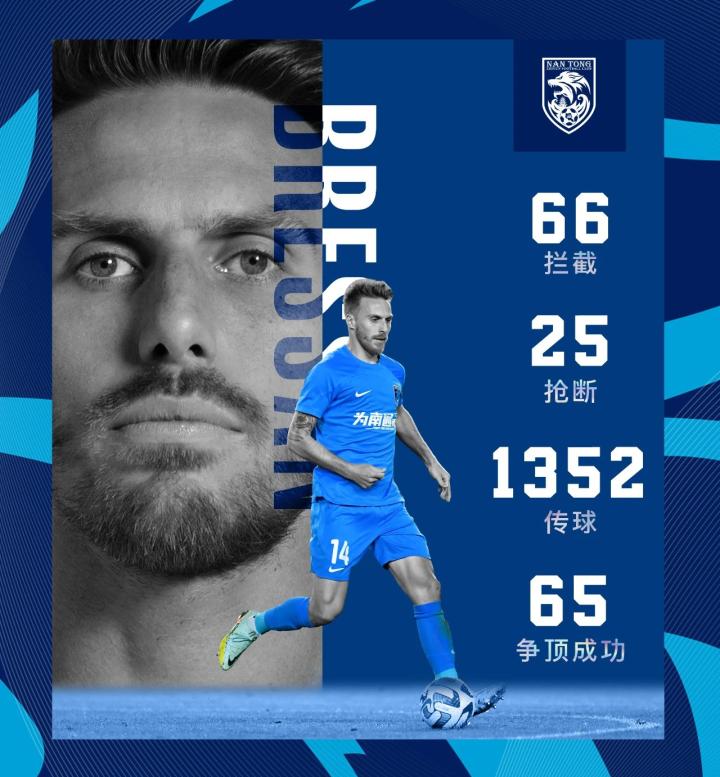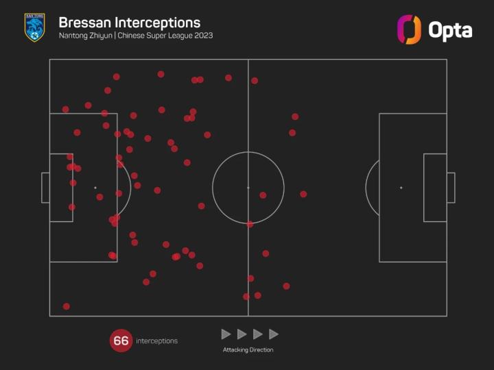 值得一提的是,布雷桑在2023赛季中超拦截榜(66次)和封堵榜(24次)上都排名榜首。他也是自2017年的拉尔夫之后,首位单赛季中超至少完成60+拦截和20+封堵的球员。
