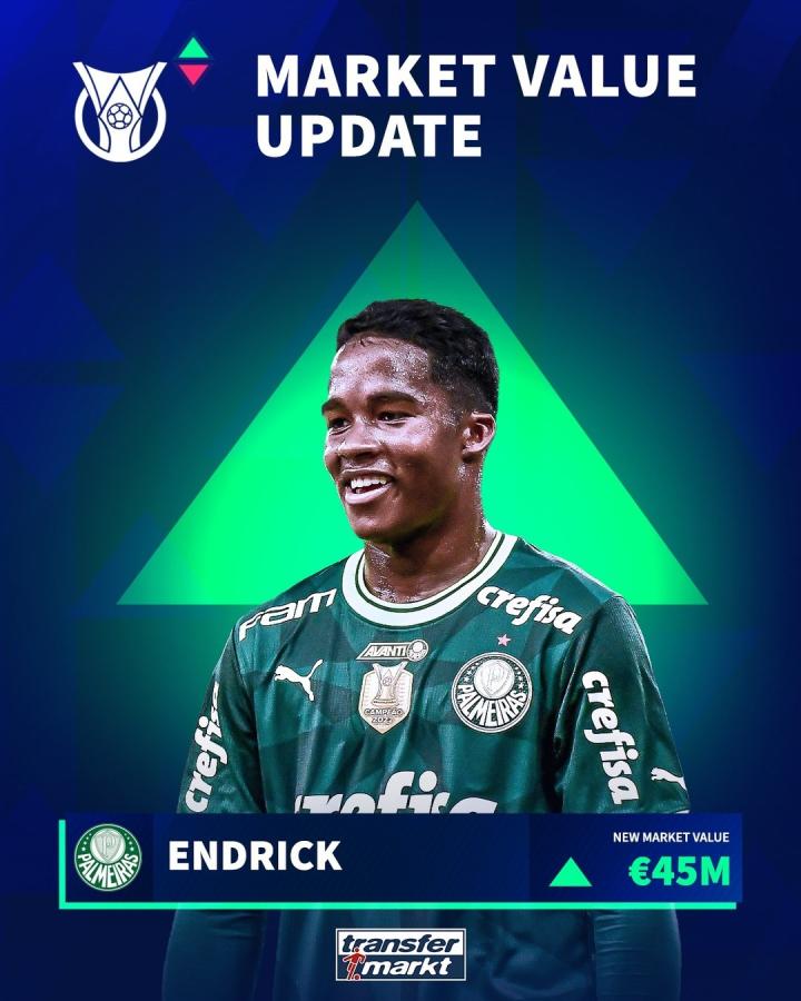 德国转会市场网站更新了巴甲球员的身价,即将加盟皇马的恩德里克身价暴涨2000万欧,达到4500万欧,为目前巴甲联赛身价最高的球员,而即将加盟巴萨的罗克上涨800万欧,目前身价为4000万欧,排名巴甲球员身价榜第二。