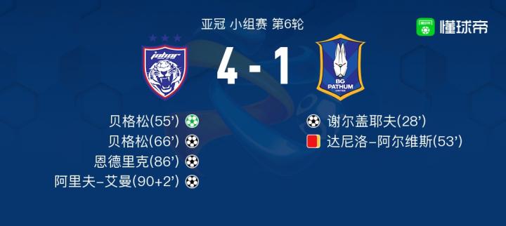 北京时间12月12日亚冠 小组赛 第6轮,柔佛新山主场对阵巴吞联。柔佛新山贝格松梅开二度,恩德里克破门,阿里夫-艾曼破门。巴吞联谢尔盖耶夫破门。最终比分4-1。