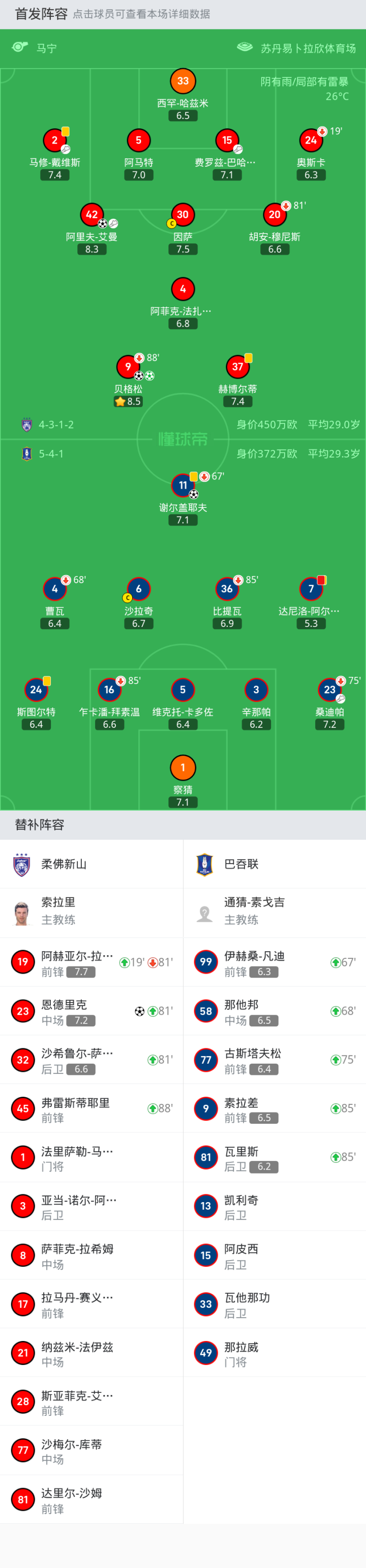 上场替补:88'45-弗雷斯蒂耶里, 81'32-沙希鲁尔-萨阿德, 81'23-恩德里克, 81'19-阿赫亚尔-拉希德