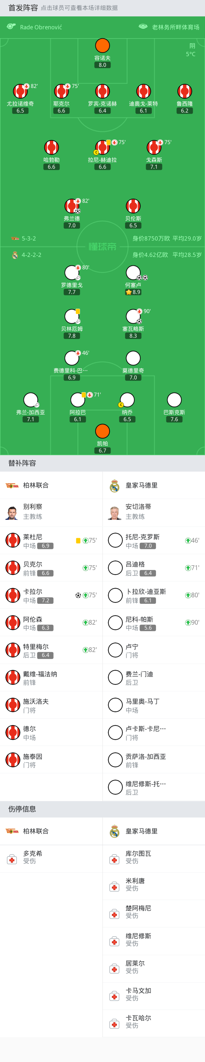 柏林联合首发:10-弗兰德, 31-罗宾-克诺赫, 26-鲁西隆, 1-容诺夫, 8-拉尼-赫迪拉, 17-贝伦斯, 19-哈勃勒, 6-戈森斯, 18-尤拉诺维奇, 3-耶克尔, 4-迪奥戈-莱特