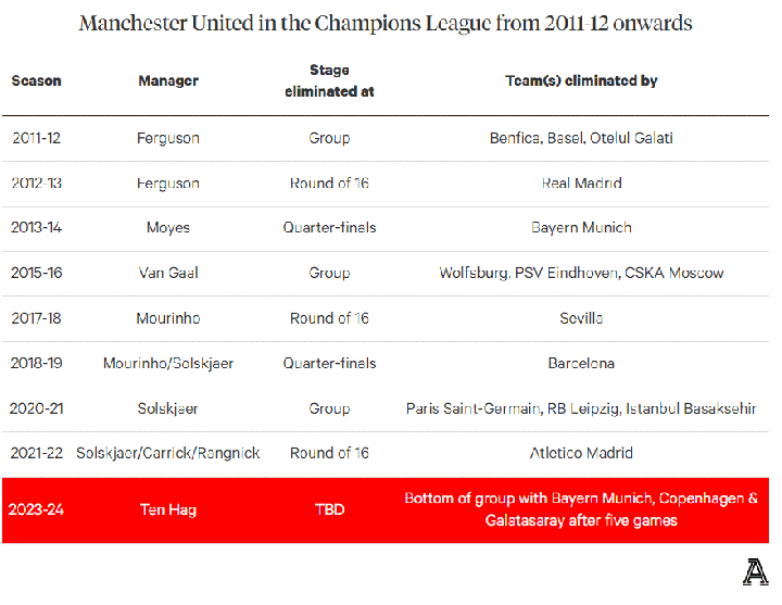 这个循环还在继续,关于过去十年的表现不佳,人们已经说了很多——写了很多——但在穆里尼奥的“负面遗产”独白近六年后,当他们盯着另一个提前出局的威胁,在加拉塔萨雷、哥本哈根以及拜仁慕尼黑的小组中垫底时,曼联2011年后糟糕的欧冠记录值得进一步审视。
