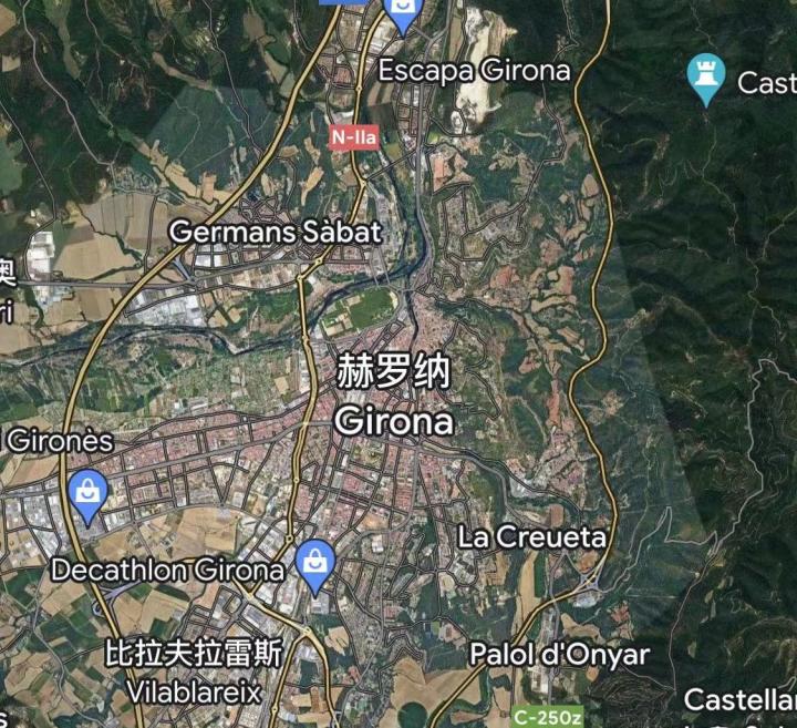 这个语言问题主要还是询问了此前驻西班牙的闫旭老师,他发了我两张谷歌地图标识,这两个“Girona-赫罗纳”“Lleida-莱里达”的对应关系,比较形象的形容可以比作地图上写的是“Beijing”,但对应的中文写的是“百京”一样,属于是太有违和感了。