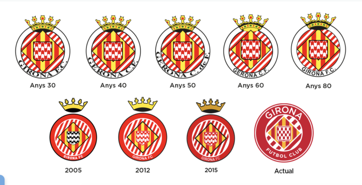 历史背景也帮助我们回答了应证了这个问题。在弗朗哥统治下的西班牙,加泰语是严令禁止出现的,因此可以发现吉罗纳建队的第一代队徽(上世纪三十年代)上写了加泰语“Girona”,但是在弗朗哥统治期间(上世纪四十年代到七十年代之间)的三代队徽中,吉罗纳都改成了卡斯蒂利亚语“Gerona”,直到弗朗哥去世之后,八十年代的第五代队徽才正式改回“Girona”。
