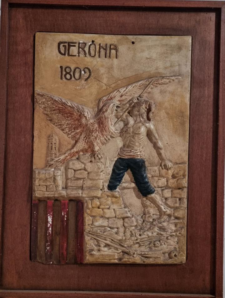 在这种情况下拿破仑派出将领圣西尔去解决巴塞罗那之围,并且解救出迪埃姆,那么想要南下前往巴塞罗那的第一个明显障碍就是吉罗纳,在1809年法军围攻吉罗纳的时候,这座坚强的要塞抵抗了超过6个月的时间,吉罗纳作为重点要塞成为拿破仑在南部战区的一个非常难啃的骨头。这个作品内容,应该就是在描述当时吉罗纳的加泰士兵顽强抵抗保卫城市的画面,但按照历史背景来说,那时的加泰罗尼亚语并非如今日的西班牙官方语言之一的地位,当时受到法国统治以及加泰语没有完全统一等各种情况,使用的依旧是卡斯蒂利亚语的写法“Gerona”。(再早些的吉罗纳还有种写法是“Gerunda”)