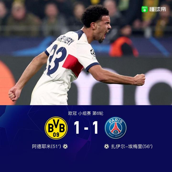 杰士邦 | 欧冠战报:巴黎1-1多特以小组第二出线,埃梅里救主