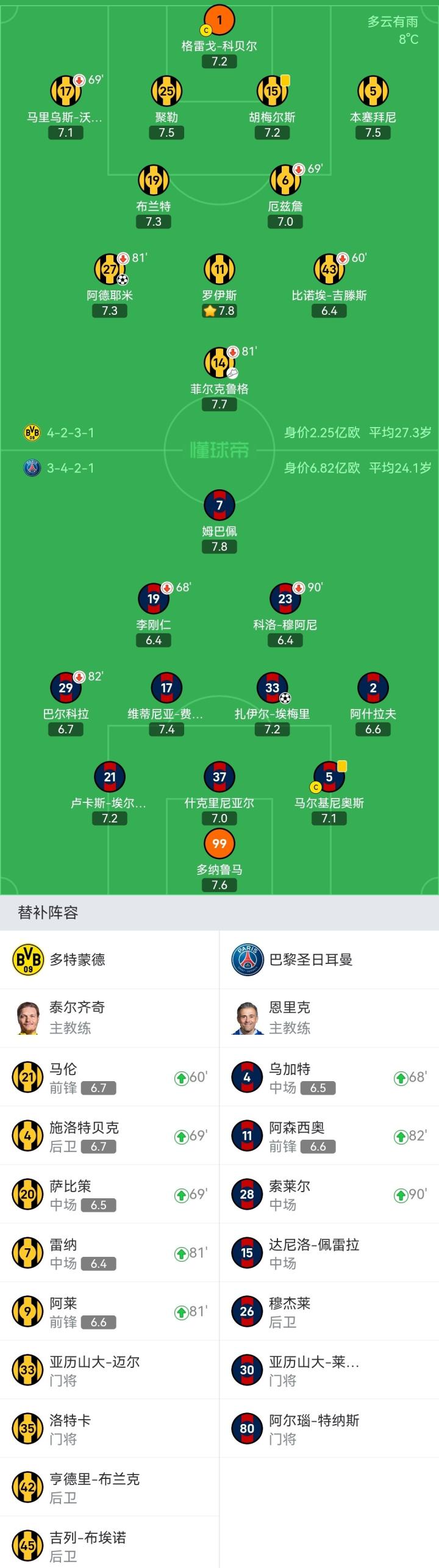 多特蒙德首发:1-格雷戈-科贝尔、17-马里乌斯-沃尔夫(69'4-施洛特贝克)、15-胡梅尔斯、25-聚勒、5-本塞拜尼、6-厄兹詹(69'20-萨比策)、19-布兰特、11-罗伊斯、43-比诺埃-吉滕斯(60'21-马伦)、27-阿德耶米(81'7-雷纳)、14-菲尔克鲁格(81'9-阿莱)