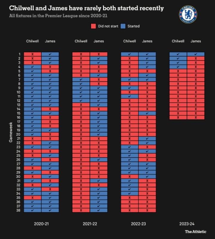 自20-21赛季至今,奇尔韦尔和詹姆斯是否首发的图表