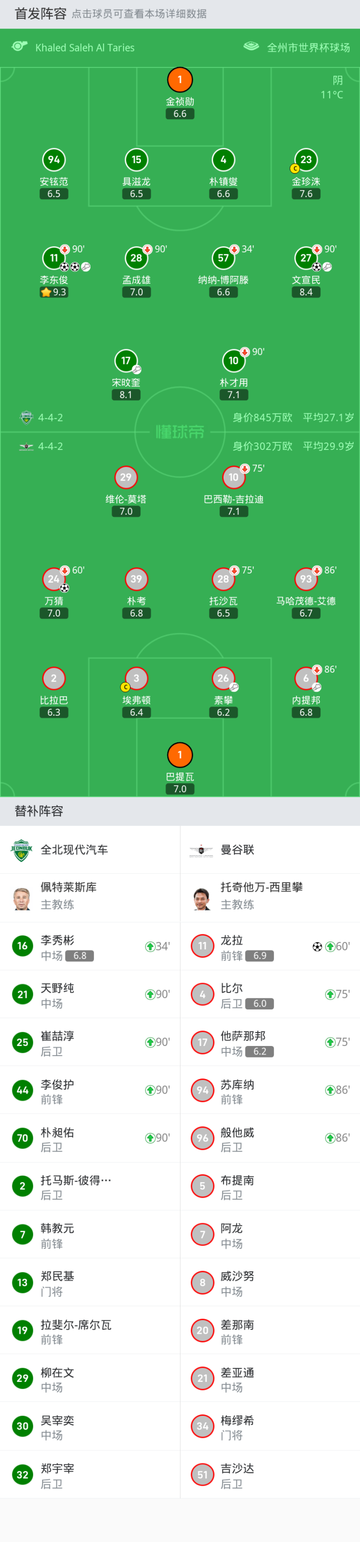 上场替补:90'+325-崔喆淳, 90'+321-天野纯, 34'16-李秀彬, 90'+644-李俊护, 90'+570-朴昶佑