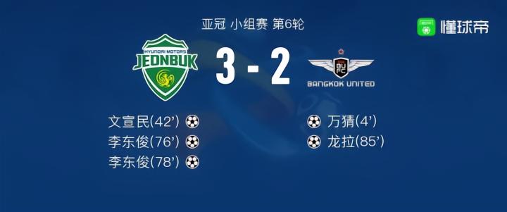 北京时间12月13日亚冠 小组赛 第6轮,全北现代汽车主场对阵曼谷联。全北现代汽车文宣民破门,李东俊梅开二度。曼谷联万猜破门,龙拉破门。最终比分3-2。