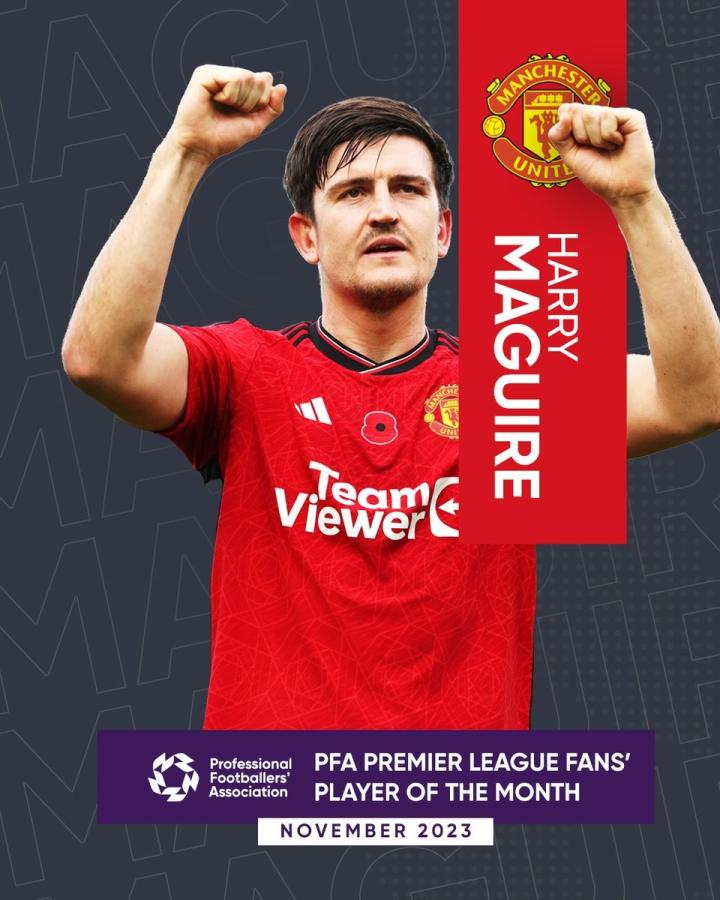 官方消息,曼联后卫马奎尔当选PFA(英格兰职业球员工会)球迷票选英超11月最佳球员。