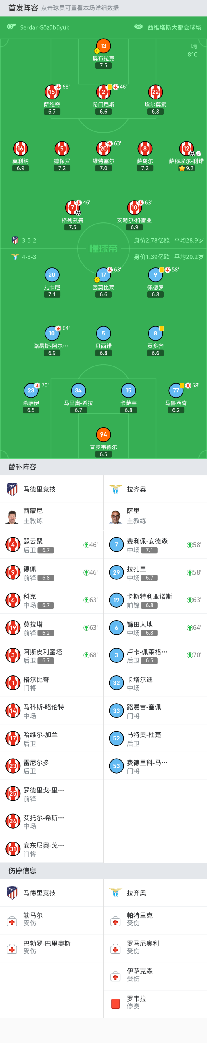 拉齐奥首发:9-佩德罗, 17-因莫比莱, 5-贝西诺, 10-路易斯-阿尔贝托, 23-希萨伊, 77-马鲁西奇, 20-扎卡尼, 94-普罗韦德尔, 8-贡多齐, 15-卡萨莱, 34-马里奥-希拉