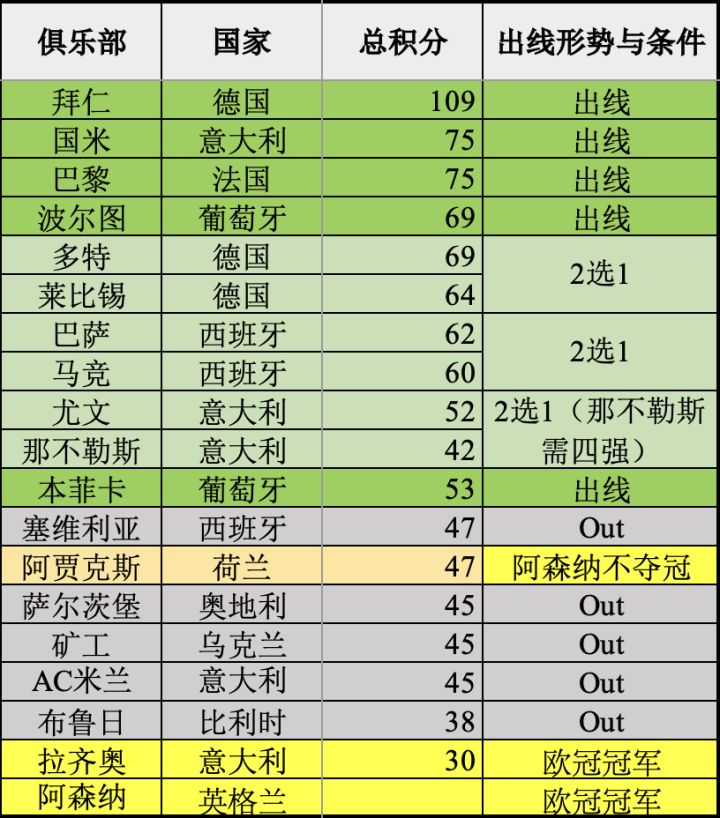 如图,拜仁、国米、巴黎和波尔图四支球队的积分领先优势明显,已经提前预定了世俱杯席位。
