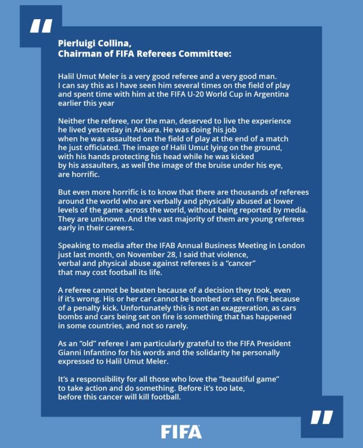 科里纳在声明中写道:“哈利勒-乌穆特-梅勒是一个非常好的裁判,也是一个非常好的人。我可以这么说,因为我在球场上见过他几次,今年早些时候在阿根廷举行的国际足联U-20世界杯上和他一起度过了一段时间。无论他是裁判还是球员,都不应该经历这样的事件。他昨天在安卡拉刚刚执法的一场比赛结束时,在球场上遭到袭击,当时他正在履行自己的职责。哈利勒-乌穆特躺在地上,双手护着头部,被袭击者踢了一脚的画面,以及他眼睛下面的瘀伤的画面,都很可怕。”