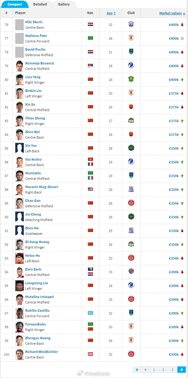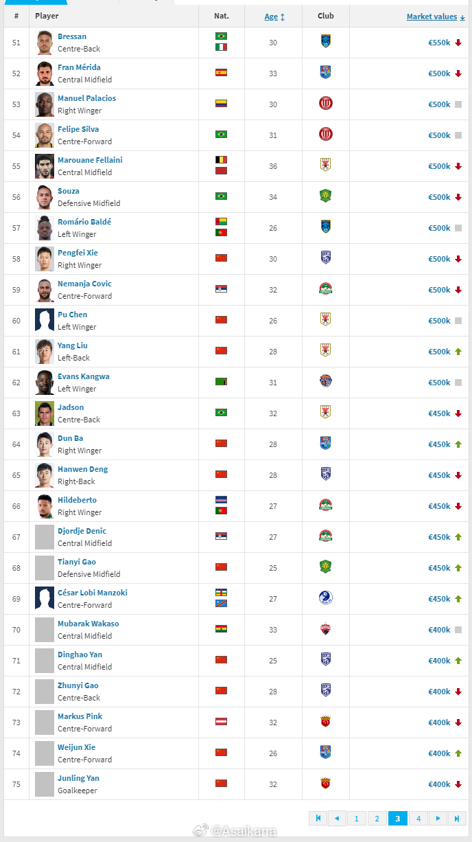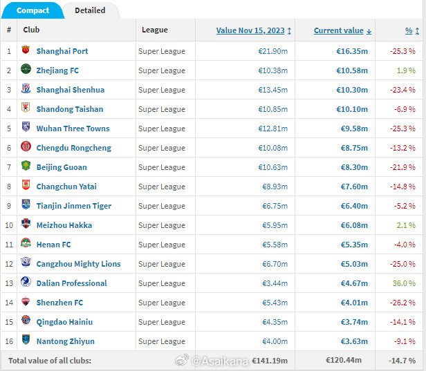中超整体身价较前下降2075万欧元,缩水14.7%,一线队年龄偏大是身价缩水的最主要原因。在全亚洲范围内,中超总身价1.2044亿欧元,列在沙特、阿联酋、卡塔尔、日本、韩国之后,为第六位。