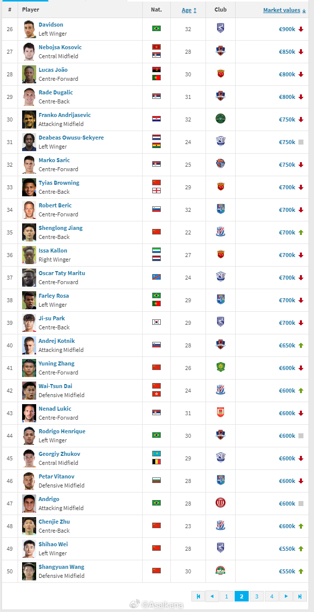 中超的中国籍球员里,武磊虽因年龄原因降到了150万欧元,但继续保持第一,蒋光太、蒋圣龙70万欧元并列第二,张玉宁、戴伟浚、朱辰杰60万欧元并列第四,韦世豪、王上源55万欧元列并第六,谢鹏飞、陈蒲、刘洋50万欧元并列第八。