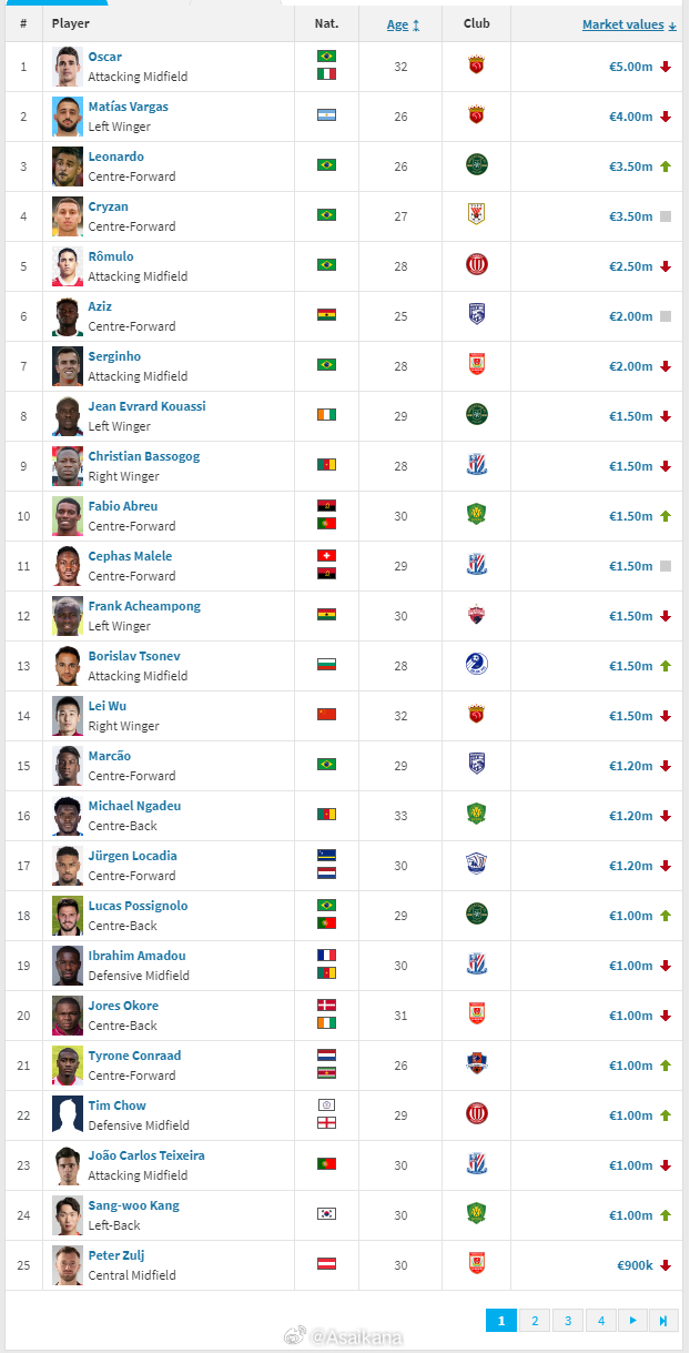 德国转会市场网(TransferMarkt.de)2023年末中超球员身价例行更新今日已上线。 此次更新后,中超联赛最高身价仍为上海海港的外援奥斯卡(500万欧元),第二为上海海港的巴尔加斯(400万欧元),第三为浙江队的莱昂纳多和山东泰山队的克雷桑(均为350万欧元),第五为成都蓉城的罗慕洛(250万欧元),第六为武汉三镇的阿齐兹和长春亚泰的塞尔吉尼奥(均为200万欧元),第八为浙江的埃弗拉、上海申花的巴索戈和马莱莱、北京国安的法比奥、深圳的阿奇姆彭、大连人的特索涅夫和上海上港的武磊(均为150万欧元)。