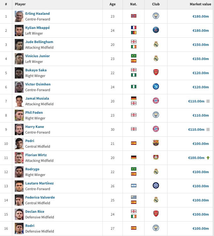 12月14日,德国转会市场网站更新了德甲球员身价,勒沃库森中场维尔茨身价上涨1500万欧,至1亿欧,成为世界足坛目前第16位德转身价破亿欧的球员,而拜仁和多特多人身价下跌。