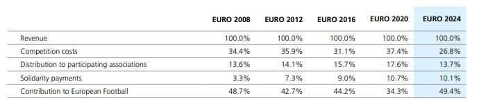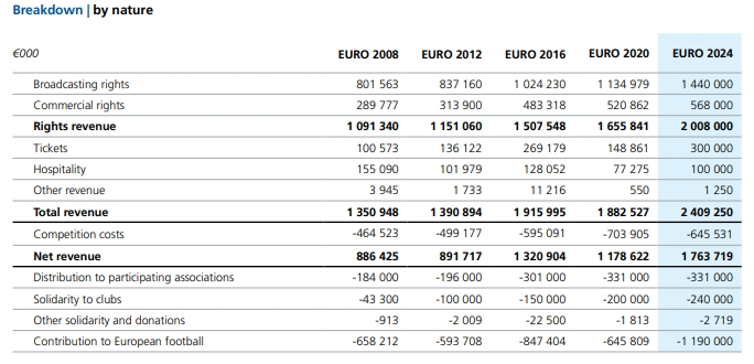 如果放在一条时间轴上来看,2020年欧洲杯奖金额度占收入比例创造历史性新高,而欧足联足球发展项目拨款的占比则创造新低。这比较显著地反映出三年前欧足联需要“救急”各成员国的状态。而如今足球商业生态仍存在不确定性,欧洲足球的长远发展需要预留更多资金托底。欧洲杯继续吸金、欧足联却疑似“吃独食”的局面,大概由此而来。