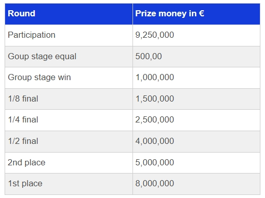 最终,2024年欧洲杯的奖金方案与上一届赛事维持一致。所有晋级正赛的球队至少获得925万欧元参赛奖金,之后每场小组赛胜利、平局,以及晋级至每一个不同的淘汰赛阶段,均有相应的叠加奖金收益。其中冠亚军可分别获得800万和500万欧元的叠加奖金。假如有球队以全胜战绩夺冠,其理论奖金总额为2825万欧元。