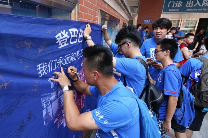2016年7月22日,申花外援登巴巴在比赛中意外骨折,手术在普陀区人民医院进行。从早上8点多开始,就有申花球迷陆陆续续来到医院,球迷们穿着“登巴巴加油”字样的T恤,拉起横幅,焦急等待着手术结果图片摄影 | 王溶江