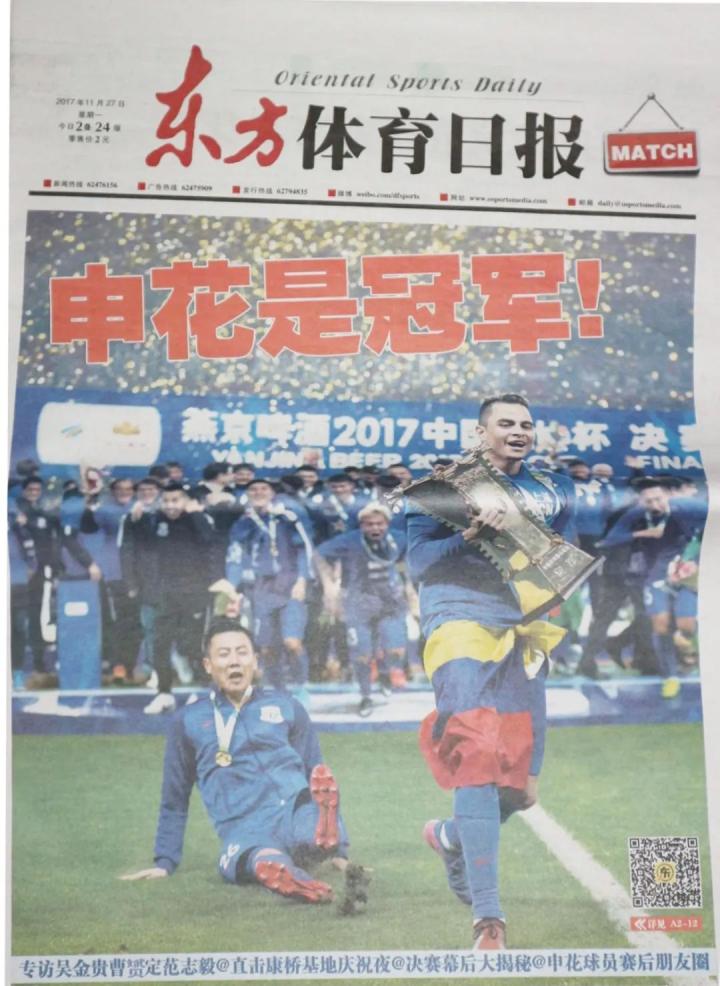 《东方体育日报》2017年11月27日,申花夺得中国足协杯冠军特刊