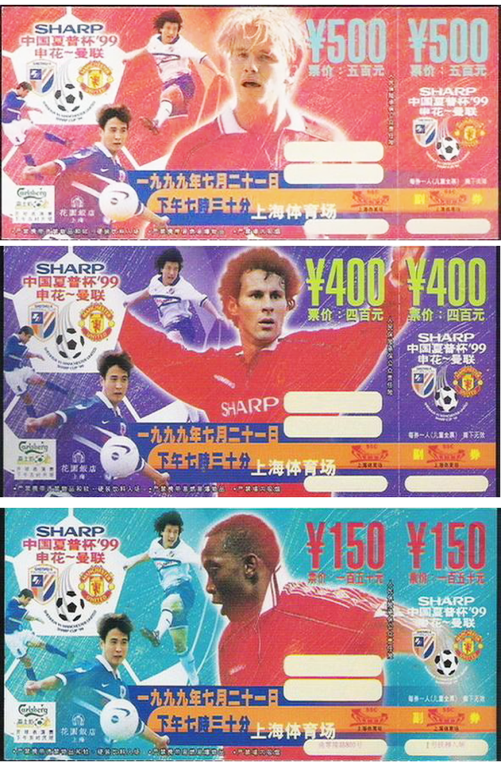 1999年7月21日,带着三冠王头衔而来的曼联在上海体育场以2比0击败上海申花,这是中国职业足球历史上最成功的商业赛事。仅一场90分钟的商业赛,门票收入就达1000万元,整场比赛盈利1600万元。2000年,申花俱乐部把球队副冠名权和胸前广告卖给托普集团,价格是3年1000万美元,这是当时职业联赛的最高纪录。