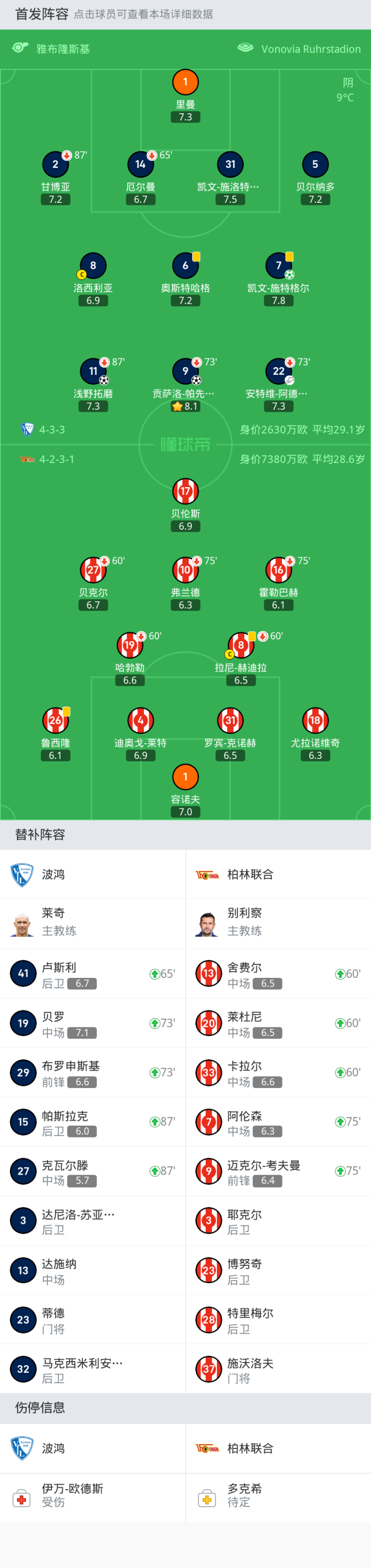 柏林联合首发:10-弗兰德, 31-罗宾-克诺赫, 26-鲁西隆, 1-容诺夫, 8-拉尼-赫迪拉, 17-贝伦斯, 27-贝克尔, 19-哈勃勒, 18-尤拉诺维奇, 4-迪奥戈-莱特, 16-霍勒巴赫