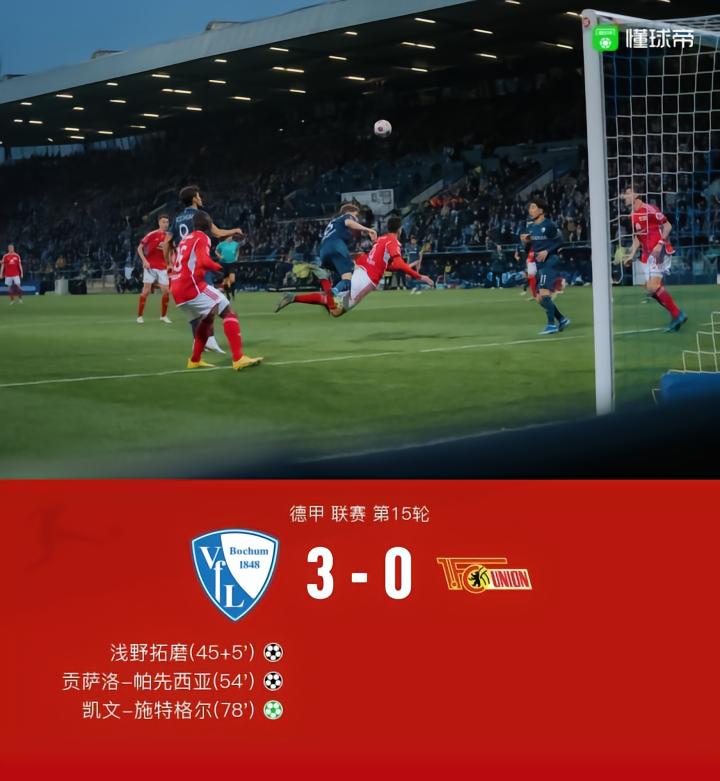 北京时间12月16日德甲 联赛 第15轮,波鸿主场对阵柏林联合。上半场,浅野拓磨抓住角球机会补射破门,为主队在中场休息前将比分领先。下半场,安特维-阿德杰伊助攻,贡萨洛-帕先西亚射门得分将比分扩大。贝罗造点,凯文-施特格尔主罚命中再下一城。最终波鸿主场3-0大胜柏林联合。