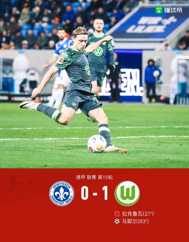 10人狼堡1-0战胜达姆施塔特,拉克鲁瓦染红,马耶尔进制胜球