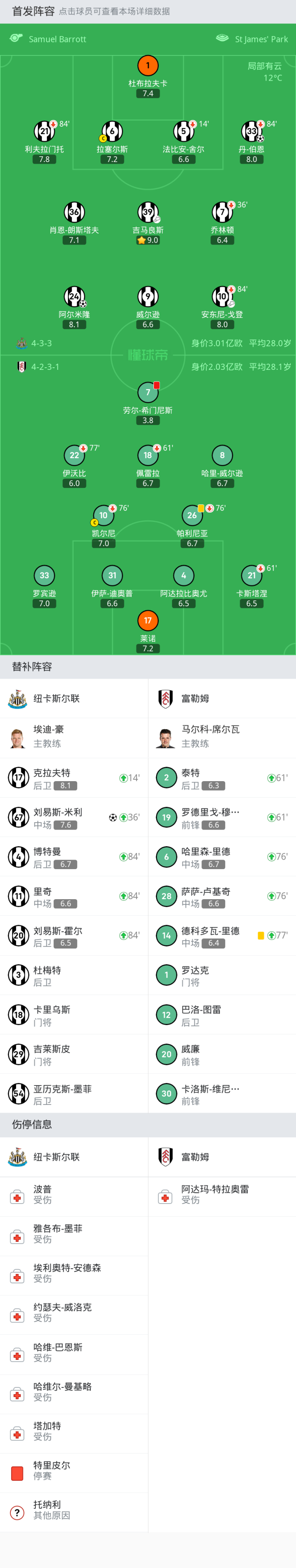 纽卡斯尔联首发:1-杜布拉夫卡, 9-威尔逊, 5-法比安-舍尔, 33-丹-伯恩, 6-拉塞尔斯, 24-阿尔米隆, 7-乔林顿, 39-吉马良斯, 36-肖恩-朗斯塔夫, 10-安东尼-戈登, 21-利夫拉门托