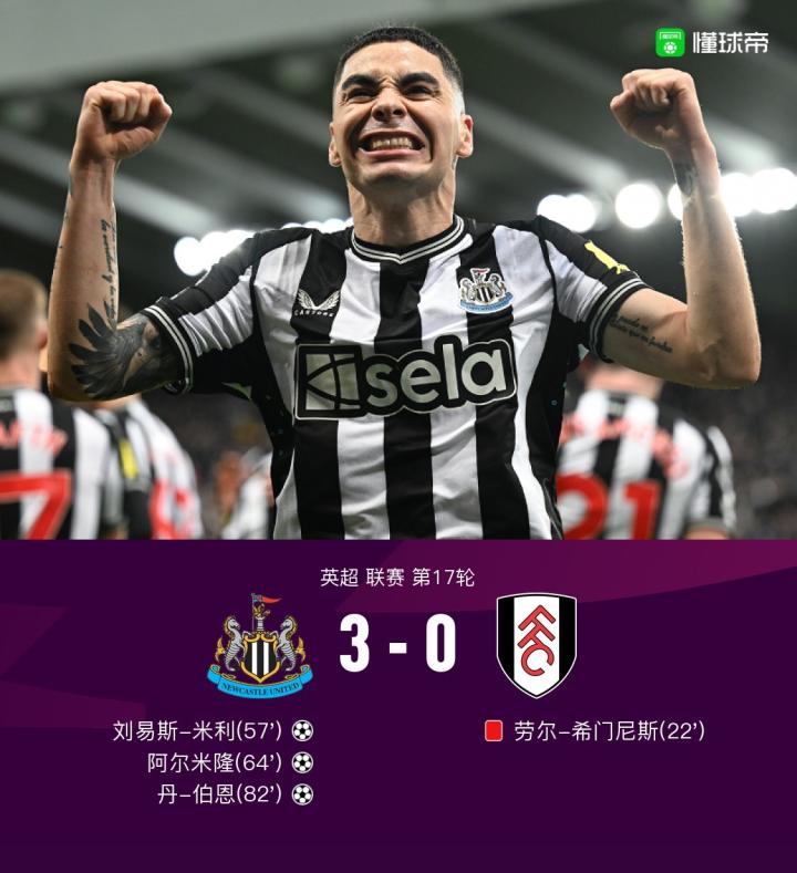 北京时间12月16日英超联赛第17轮,纽卡斯尔联主场对阵富勒姆。比赛第22分钟,劳尔-希门尼斯染红,第57分钟,刘易斯-米利率先破门,第64分钟,阿尔米隆再下一城,第82分钟,丹-伯恩锁定胜局。最终比分纽卡3-0富勒姆。