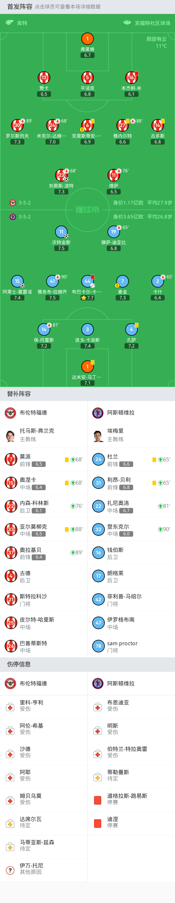布伦特福德首发:13-赞卡, 16-本杰明-米, 6-克里斯蒂安-内尔高, 14-古多斯, 1-弗莱肯, 11-维萨, 27-雅内尔特, 5-平诺克, 30-罗尔斯列夫, 24-米克尔-达姆斯高, 23-刘易斯-波特