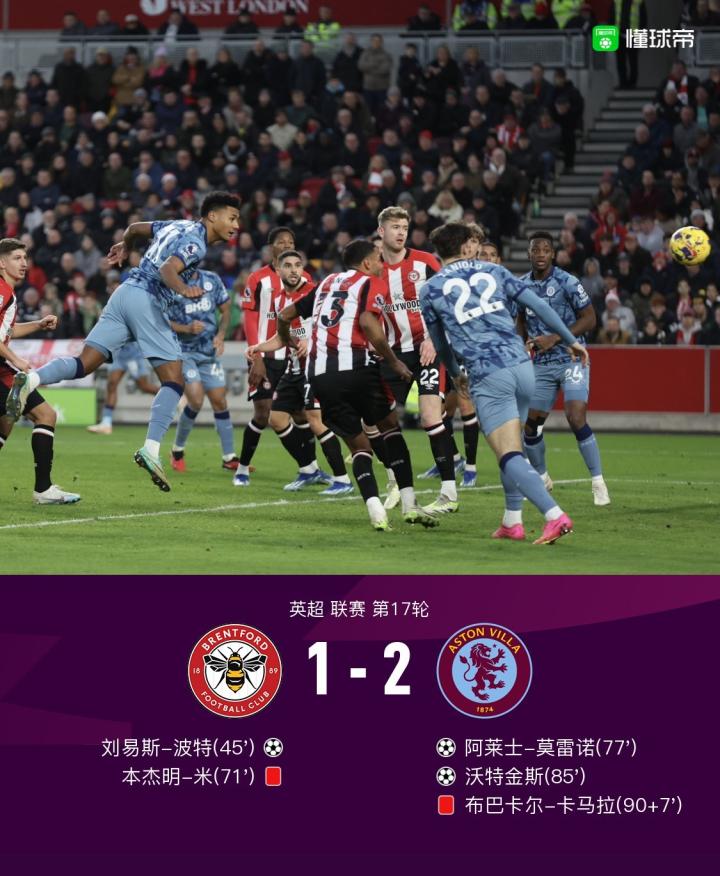 北京时间12月17日英超 联赛 第17轮,布伦特福德主场对阵阿斯顿维拉。上半场布伦特福德攻势占优,尾声阶段由刘易斯-波特破门首开记录;下半场本杰明-米放铲吃到红牌,阿莱士-莫雷诺头球破门扳平比分,随后沃特金斯头球破门完成反超,沃特金斯的庆祝动作引发双方激烈冲突,比赛最后阶段,卡马拉在冲突中吃到红牌。最终维拉客场2-1逆转布伦特福德暂时攀升至积分榜次席。