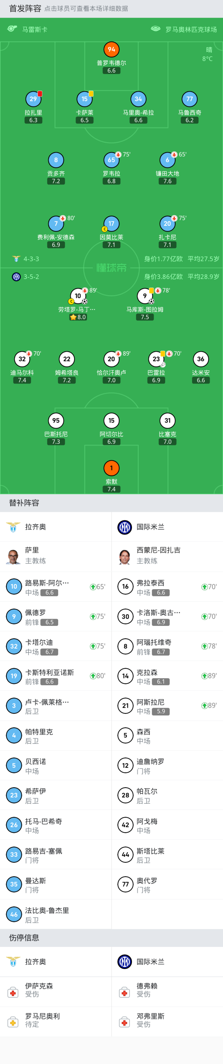 拉齐奥首发:17-因莫比莱, 7-费利佩-安德森, 29-拉扎里, 77-马鲁西奇, 20-扎卡尼, 94-普罗韦德尔, 6-镰田大地, 8-贡多齐, 15-卡萨莱, 65-罗韦拉, 34-马里奥-希拉