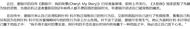 谢丽尔迅速来到医院进行了性病和艾滋病的检测,好在最终没有问题。这件事可不是信口胡说,也不是八卦媒体的猜测,而是多年后,谢丽尔在自传《我的故事》中亲自披露的。