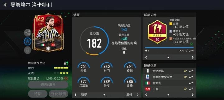 洛卡特利是三国活动带给玩家们的惊喜。他是少见的意式顶尖后腰,有着卓越的身体模型与均衡的数据面板。洛卡特利的没有明显的短板,颇有六边形中场的潜力。